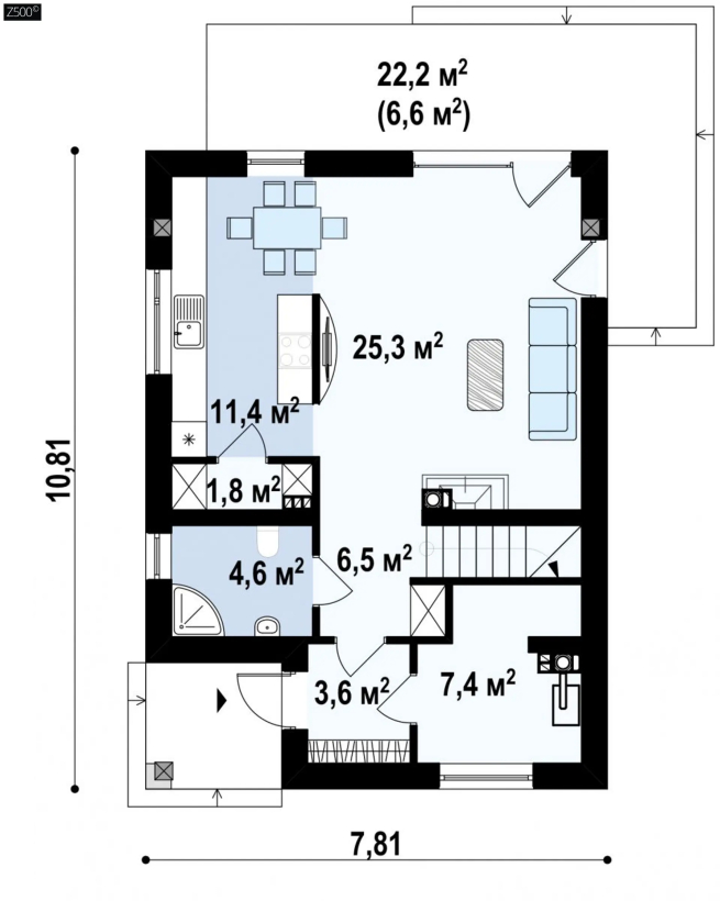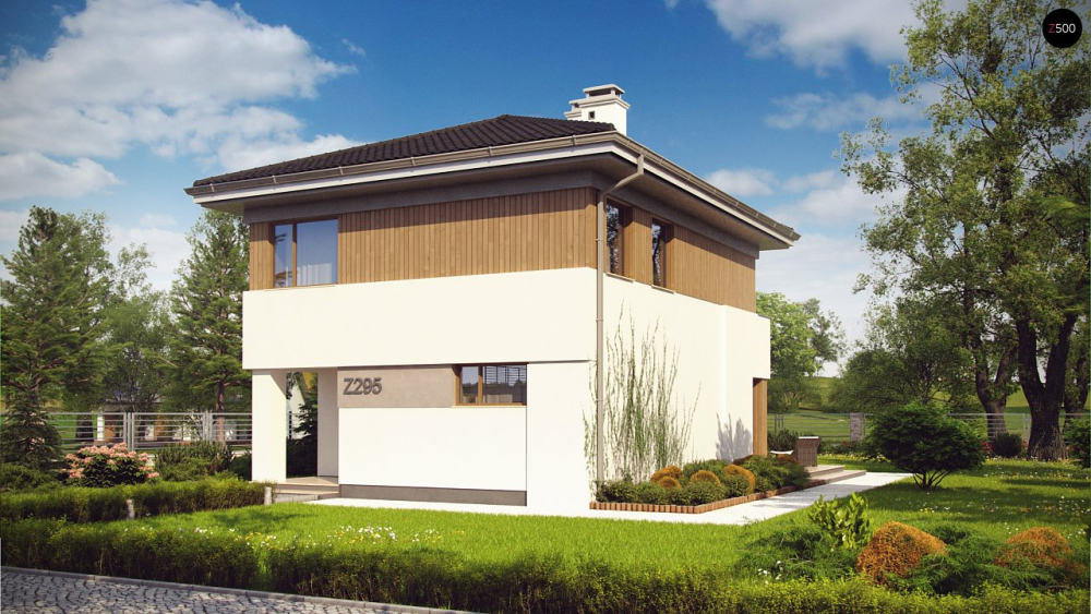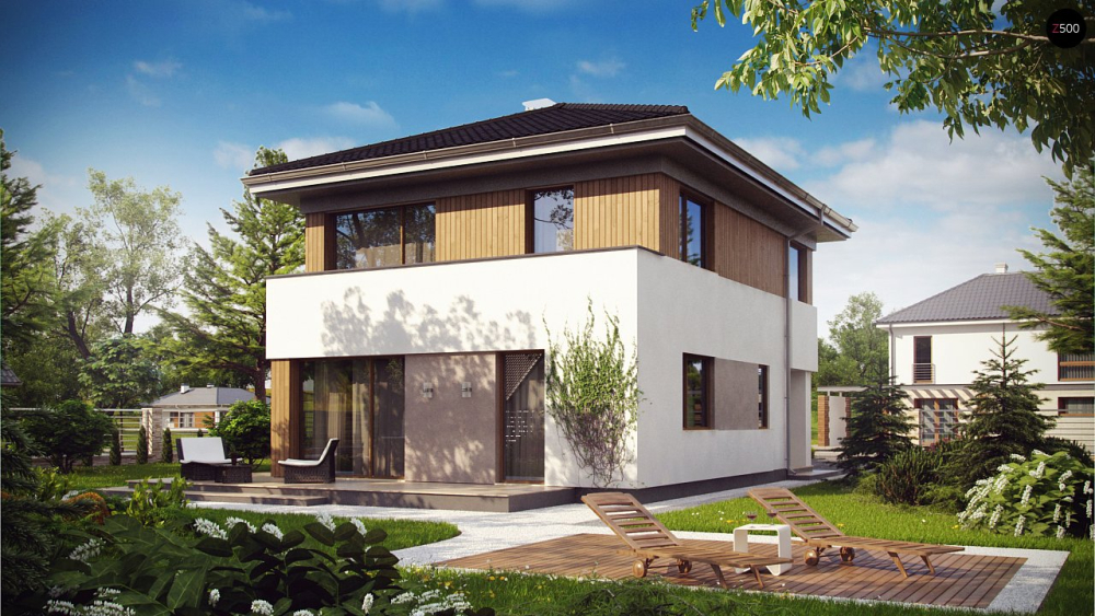 Аккуратный дом в ультрасовременном стиле с четырехскатной крышей. Также подойдет для узкого участка.
